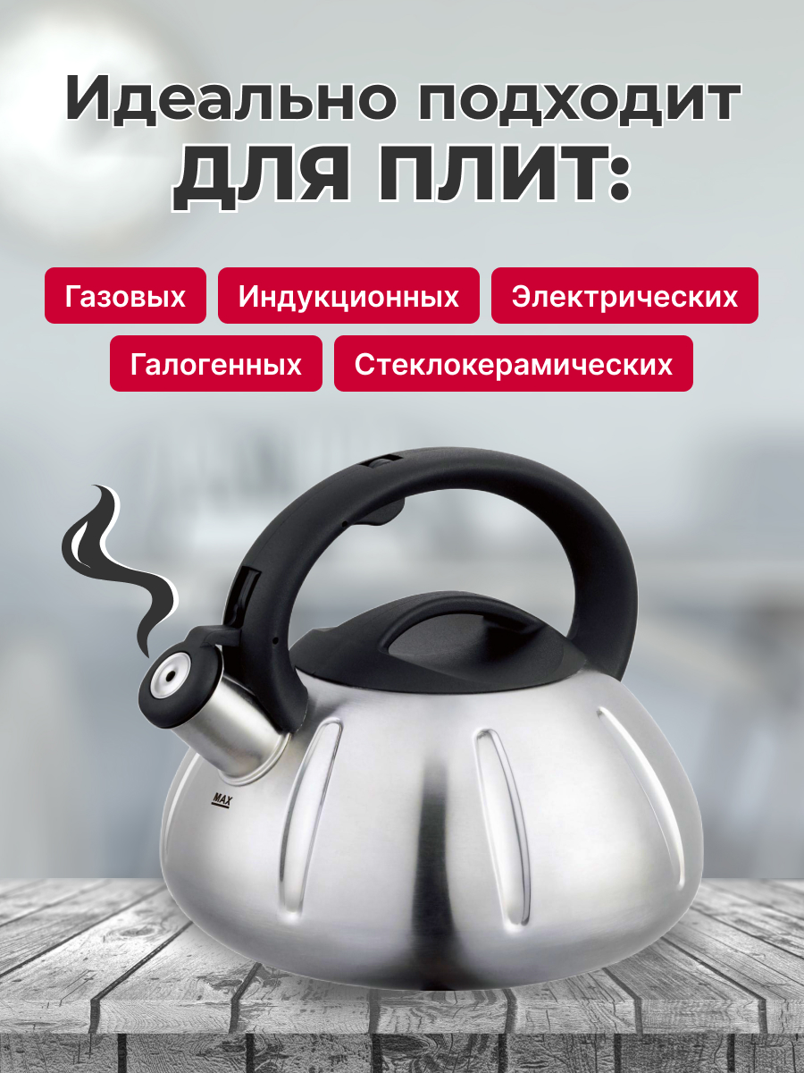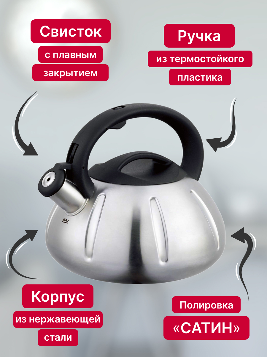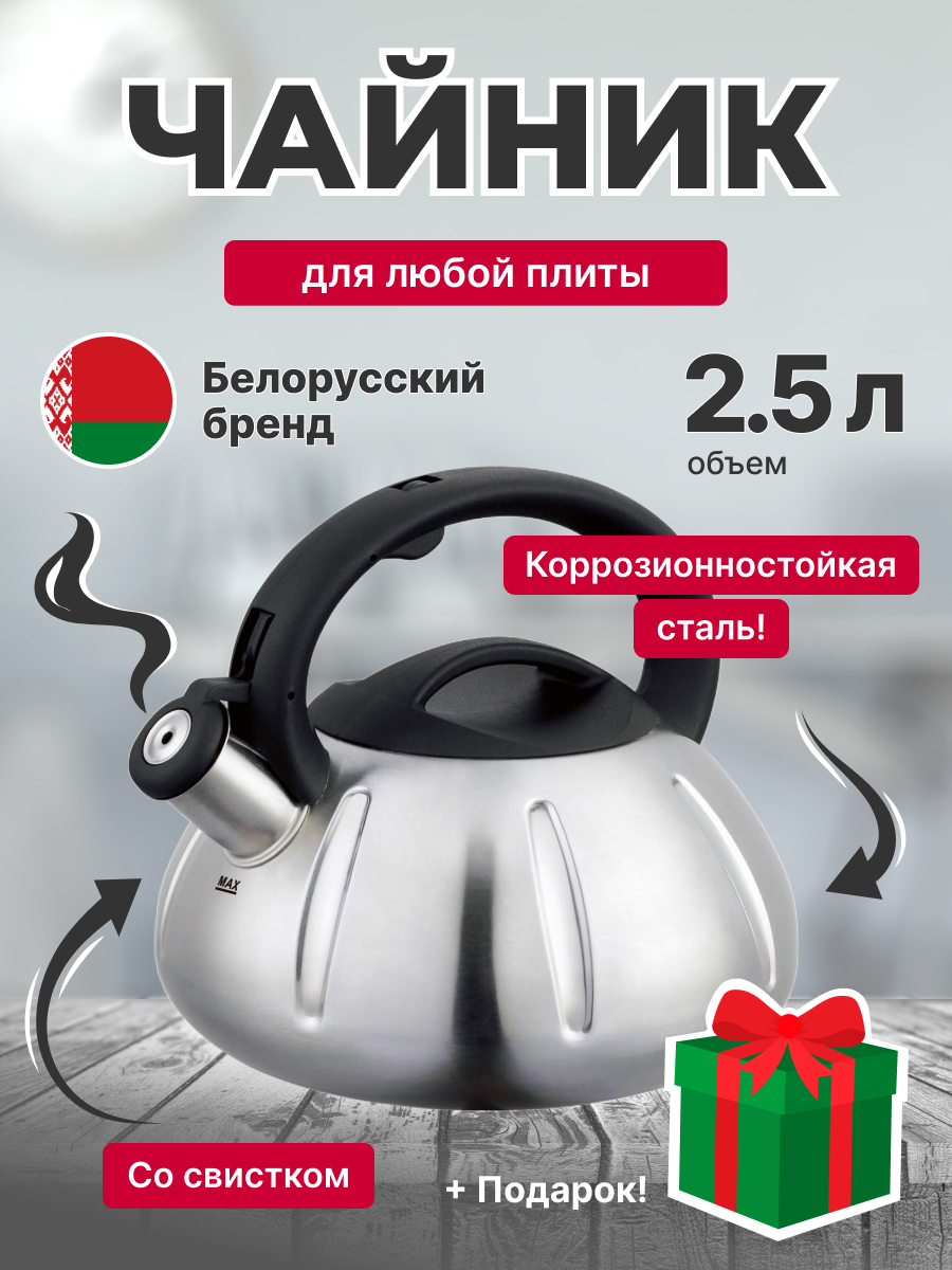 Чайник из нержавеющей стали для плиты со свистком КС-5 от белорусского производителя Polly Belarus станет неотъемлемым предметом на кухне. Объем кухонного чайника - 2.5 литра, что позволит вместить в себя огромное количество жидкости за раз! Наш чайник изготовлен из коррозионно-стойкой стали, благодаря чему он подходит для газовой, индукционной, электрической, стеклокерамической и галогенной плит, а также в процессе эксплуатации не вступает ни в какие химические реакции и не выделяет вредные вещества. Для вашего удобства, чайник Polly оснащен свистком, сообщающим о закипании воды. Ручка выполнена из термостойкого пластика. Для красоты используется полировка “Сатин”. Чайник из нержавеющей стали со свистком станет отличным выбором не только для себя, но и в качестве подарка маме, папе, бабушке, дедушке или второй половинке на день рождения, 8 марта, 14 или 23 февраля, новый год.