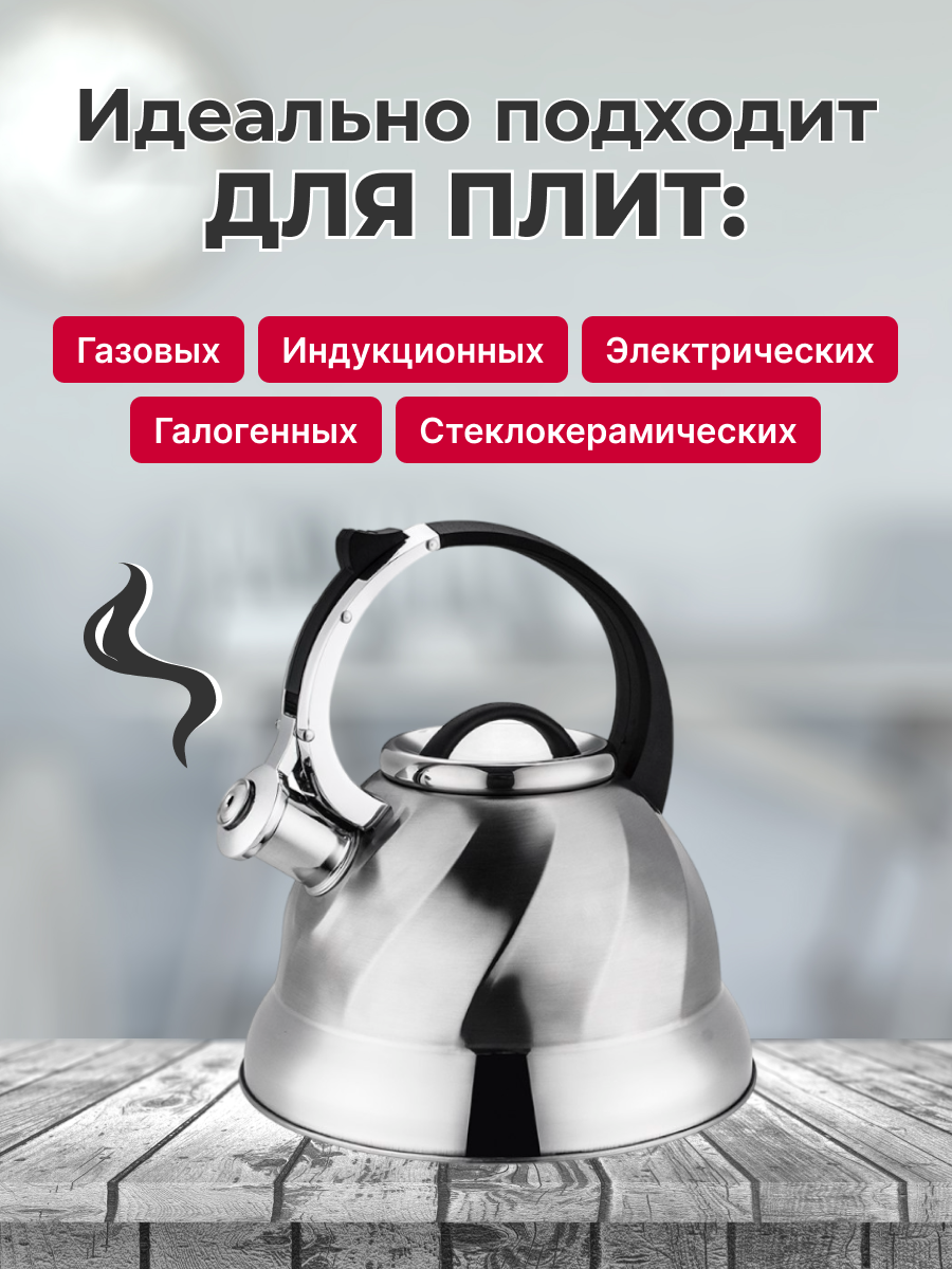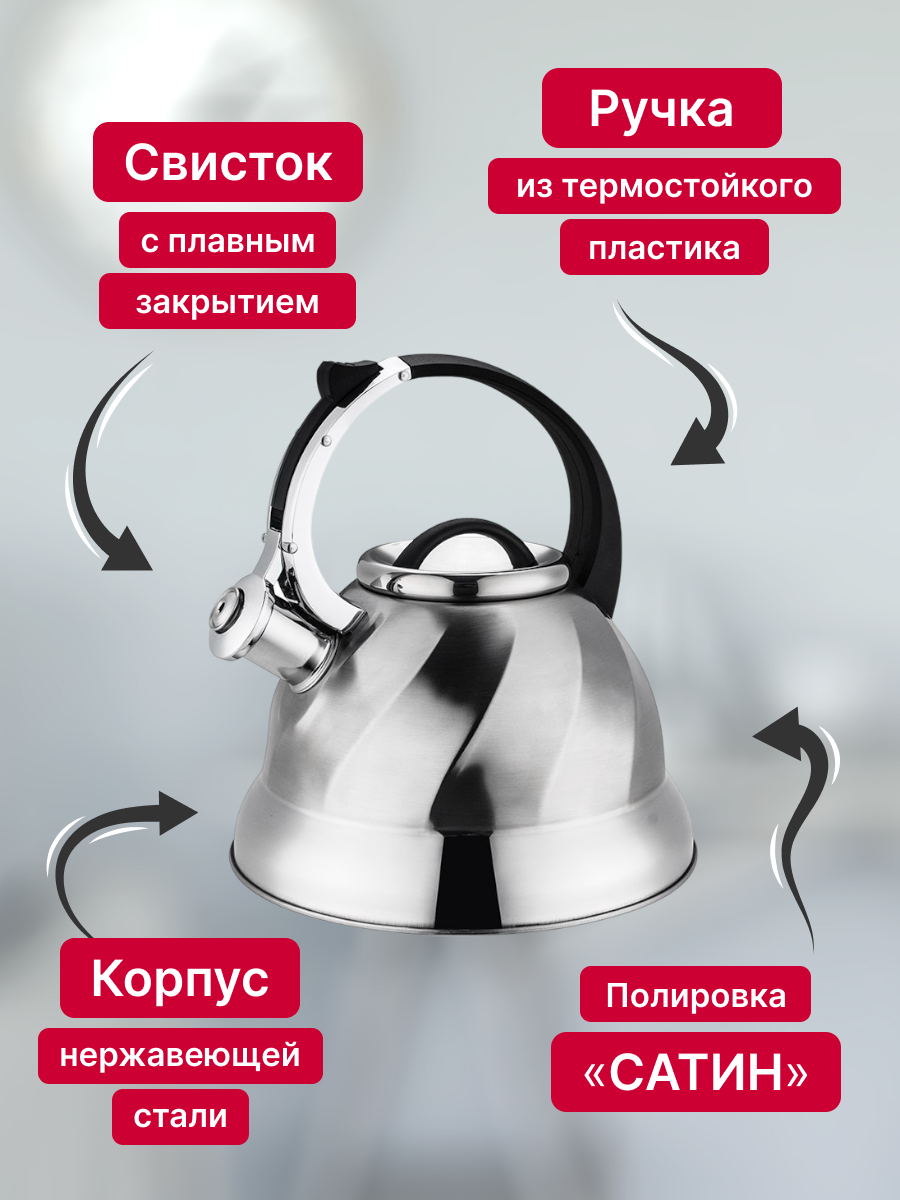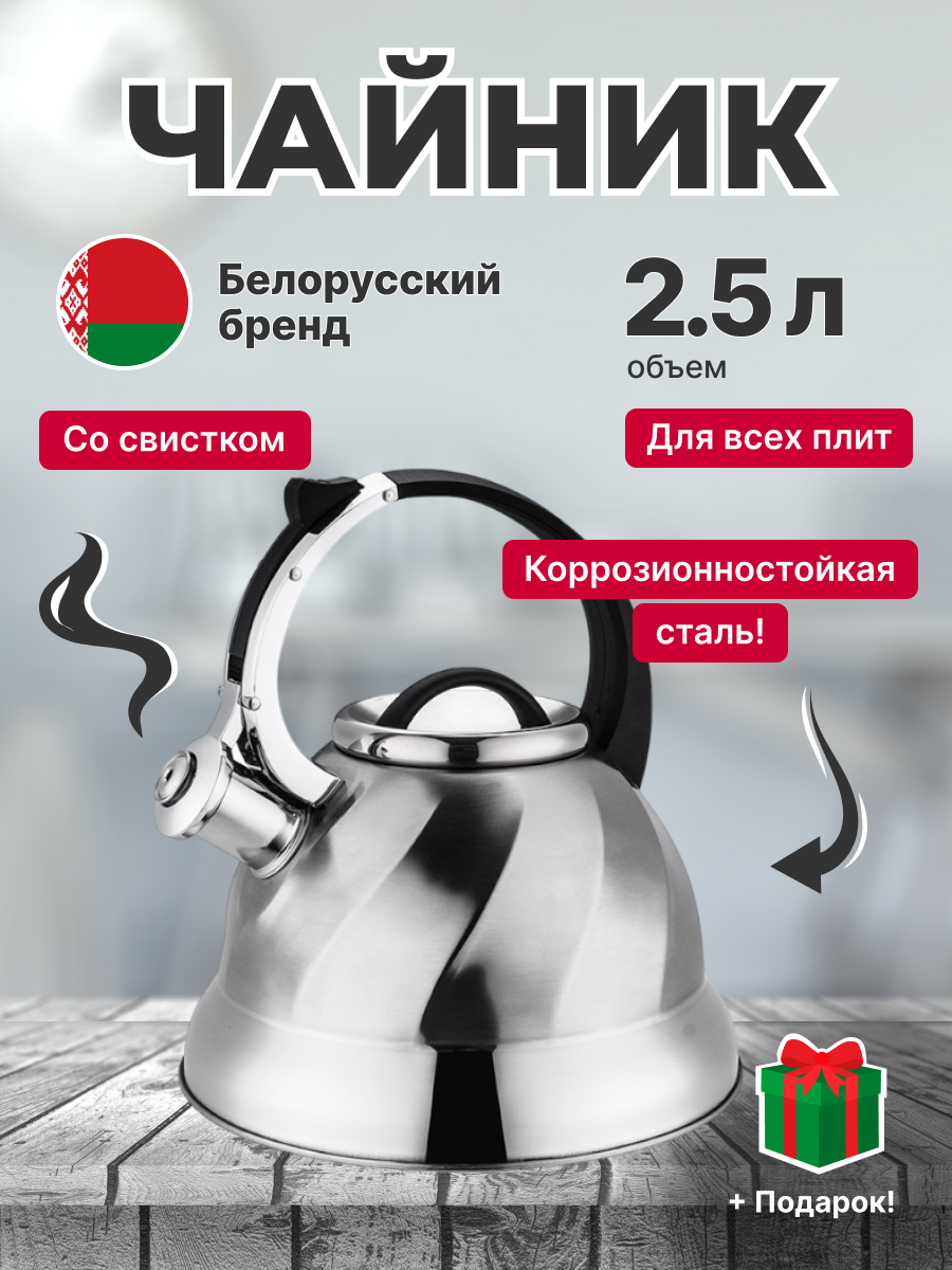 Чайник из нержавеющей стали для плиты со свистком КС-7 от белорусского производителя Polly Belarus станет неотъемлемым предметом на кухне. Объем кухонного чайника - 2.5 литра, что позволит вместить в себя огромное количество жидкости за раз! Наш чайник изготовлен из коррозионно-стойкой стали, благодаря чему он подходит для газовой, индукционной, электрической, стеклокерамической и галогенной плит, а также в процессе эксплуатации не вступает ни в какие химические реакции и не выделяет вредные вещества. Для вашего удобства, чайник Polly оснащен свистком, сообщающим о закипании воды. Ручка выполнена из термостойкого пластика. Для красоты используется полировка “Сатин”. Чайник из нержавеющей стали со свистком станет отличным выбором не только для себя, но и в качестве подарка маме, папе, бабушке, дедушке или второй половинке на день рождения, 8 марта, 14 или 23 февраля, новый год.