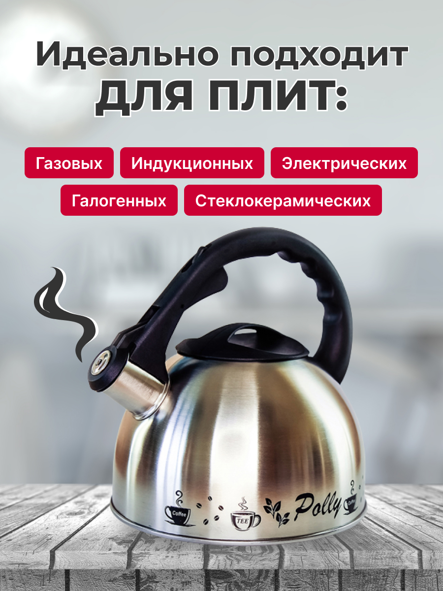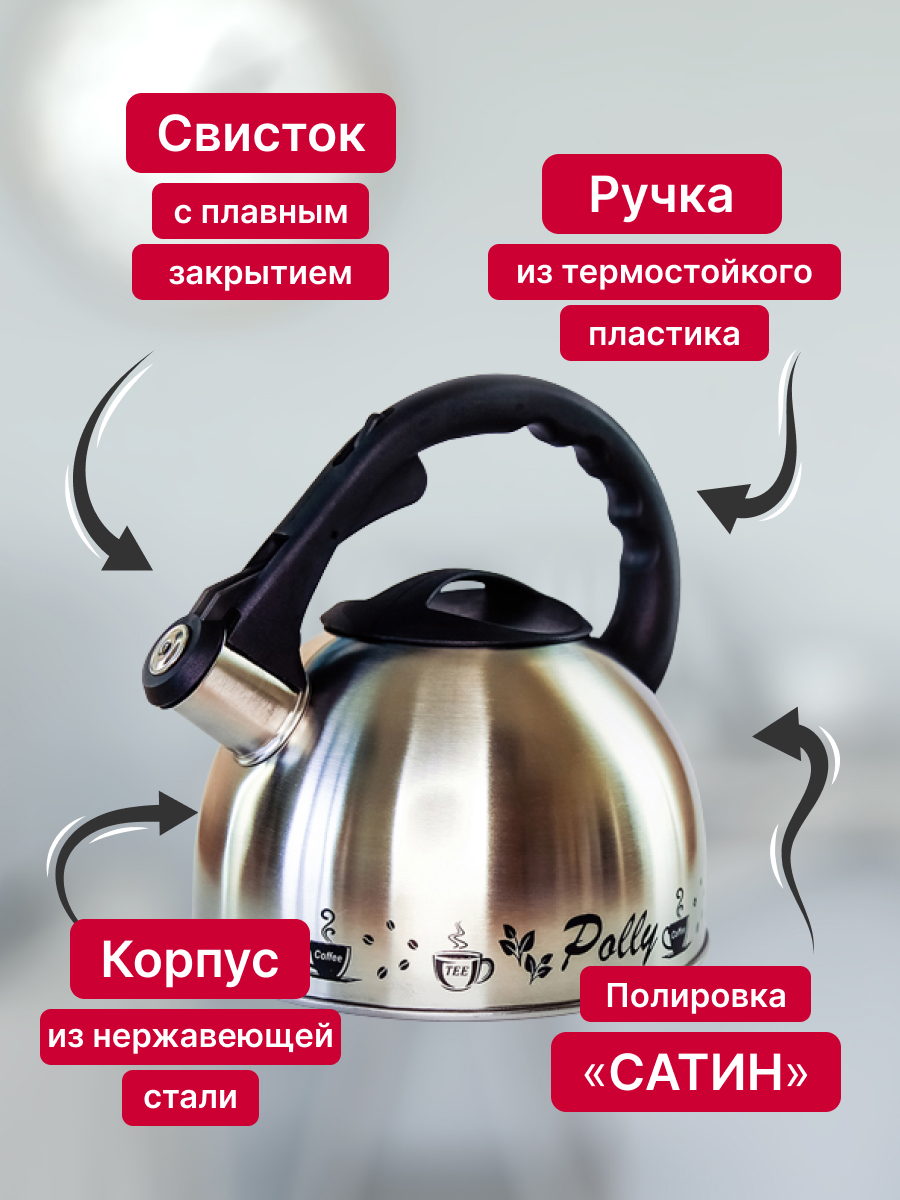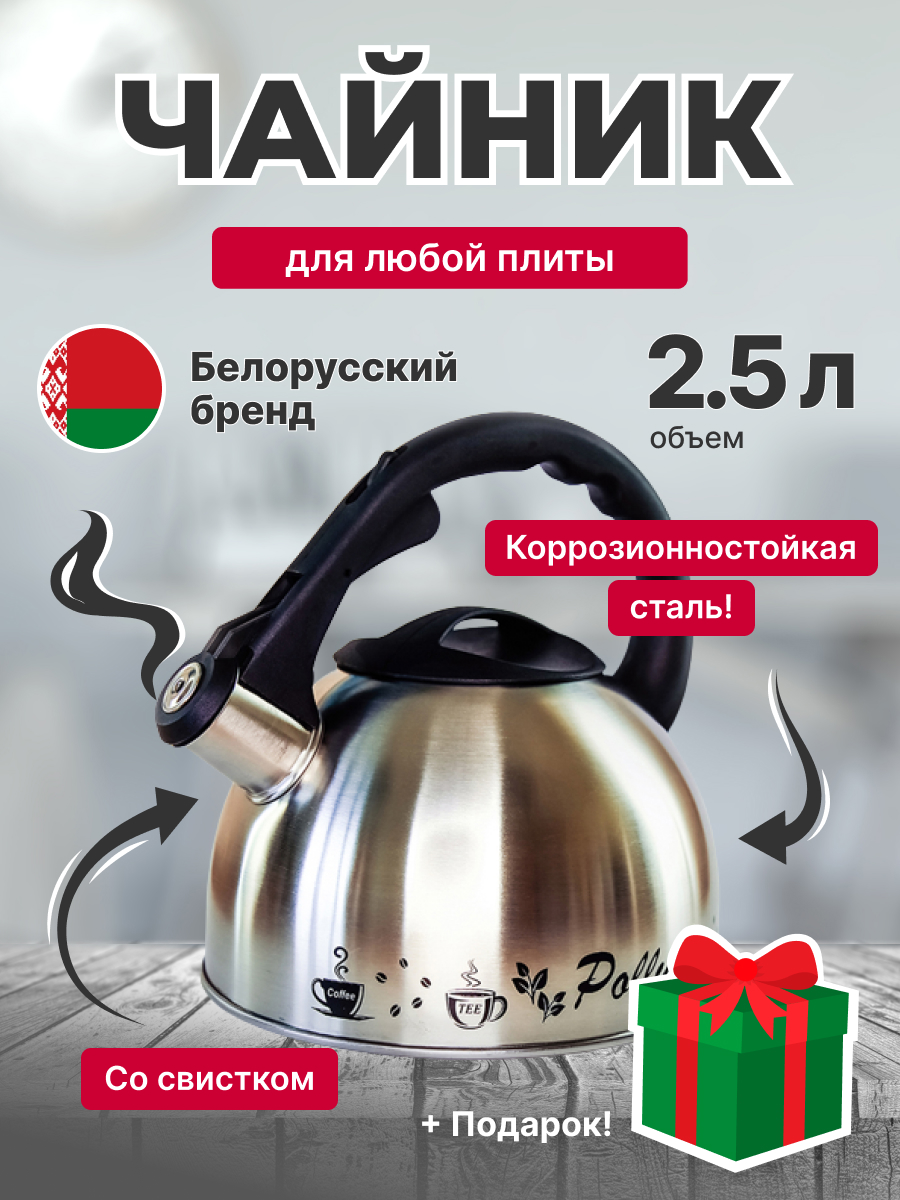 Чайник из нержавеющей стали для плиты со свистком КС-2 от белорусского производителя Polly Belarus станет неотъемлемым предметом на кухне. Объем кухонного чайника - 2.5 литра, что позволит вместить в себя огромное количество жидкости за раз! Наш чайник изготовлен из коррозионно-стойкой стали, благодаря чему он подходит для газовой, индукционной, электрической, стеклокерамической и галогенной плит, а также в процессе эксплуатации не вступает ни в какие химические реакции и не выделяет вредные вещества. Для вашего удобства, чайник Polly оснащен свистком, сообщающим о закипании воды. Ручка выполнена из термостойкого пластика. Для красоты используется полировка “Сатин”. Чайник из нержавеющей стали со свистком станет отличным выбором не только для себя, но и в качестве подарка маме, папе, бабушке, дедушке или второй половинке на день рождения, 8 марта, 14 или 23 февраля, новый год.