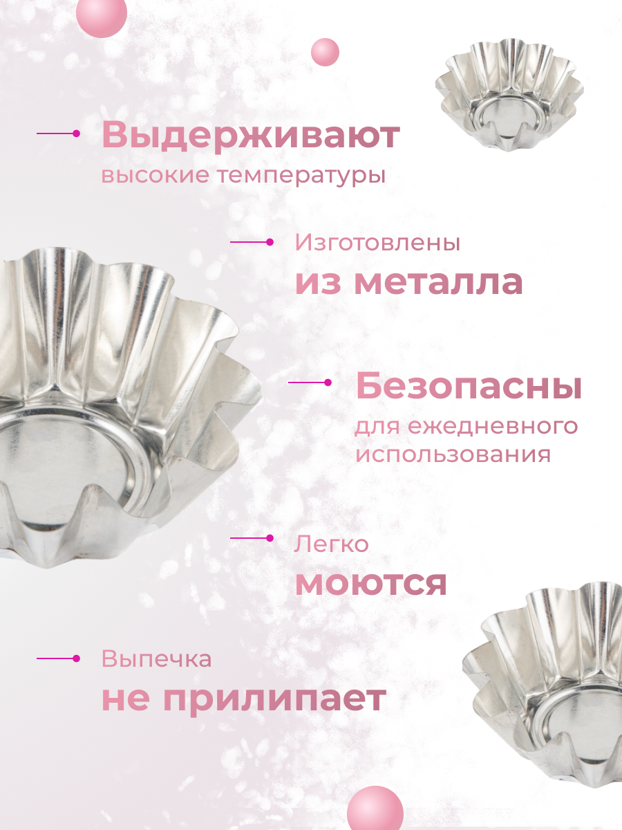 Набор форм для выпечки десертов и закусок - незаменимый помощник на кухне каждой уважающей себя хозяйки. У нас представлено несколько наборов: по 6 и 12 формочек, благодаря чему вы сможете приготовить сразу большое количество разнообразных десертов: с клубникой, бананами, шоколадом и другие, которые покажутся вам интересным решением. Наша форма для выпечки изготовлена из экологически безопасного высококачественного металла, благодаря чему она не царапается, не поломается и не испортится со временем, а уход за ней невероятно прост: достаточно просто обмыть его под водой, чтобы вернуть первозданный вид. Кондитерские формы для выпечки помогут придать вашему шедевру необычную форму. Набор подходит для любого теста: тортики, кексики, корзиночки, тарталетки, маффины, капкейки, бисквиты и множество другой выпечки, какая только придет вам в голову. Благодаря материалу, в процессе готовы ничего не пригорает и легко извлекается после: выпечка буквально “выскакивает сама”. Компактный размер форм позволяет экономить место на кухне. Готовые кексы легко извлекать из формочек. Металл не впитывает неприятный запах и не накапливает вредные вещества, из-за чего ваша выпечка будет идеальна каждый раз! Набор форм для выпечки станет отличным подарком маме, бабушке, тете, сестре или второй половинке на день рождения, 8 марта, 14 февраля или новый год. Перед первым использованием вымойте формы для выпечки кекса с небольшим количеством моющего средства, высушите, смажьте тонким слоем масла. Выпекайте любимые кексы с удовольствием, радуйте своих близких и друзей, приятного аппетита!
