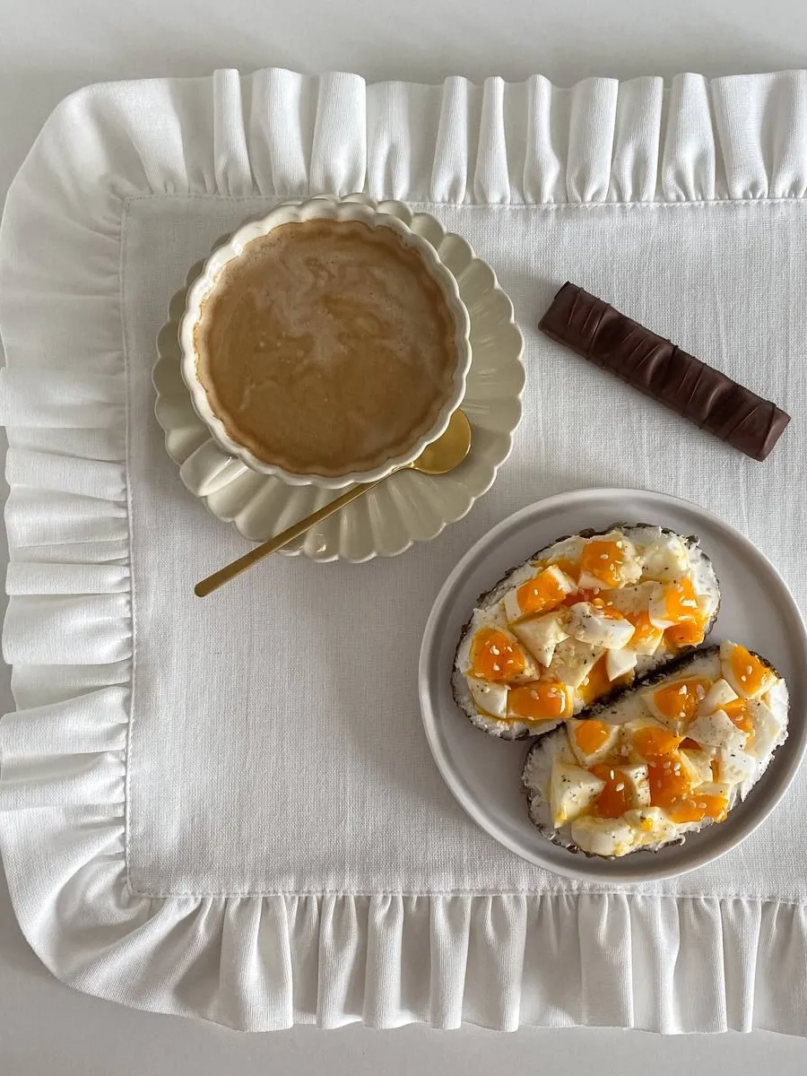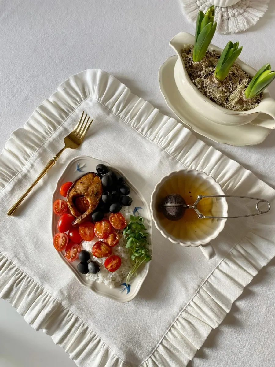 Салфетки с рюшами по всем четырем сторонам, что придает им уникальный и неповторимый шарм. Состав ткани включает 59% лена и 41% хлопка, что создает идеальное сочетание прочности и мягкости. Натуральный лен, используемый в производстве, известен своими антибактериальными и гипоаллергенными свойствами. Эти свойства делают салфетки безопасными для здоровья и идеально подходящими для ежедневного использования.