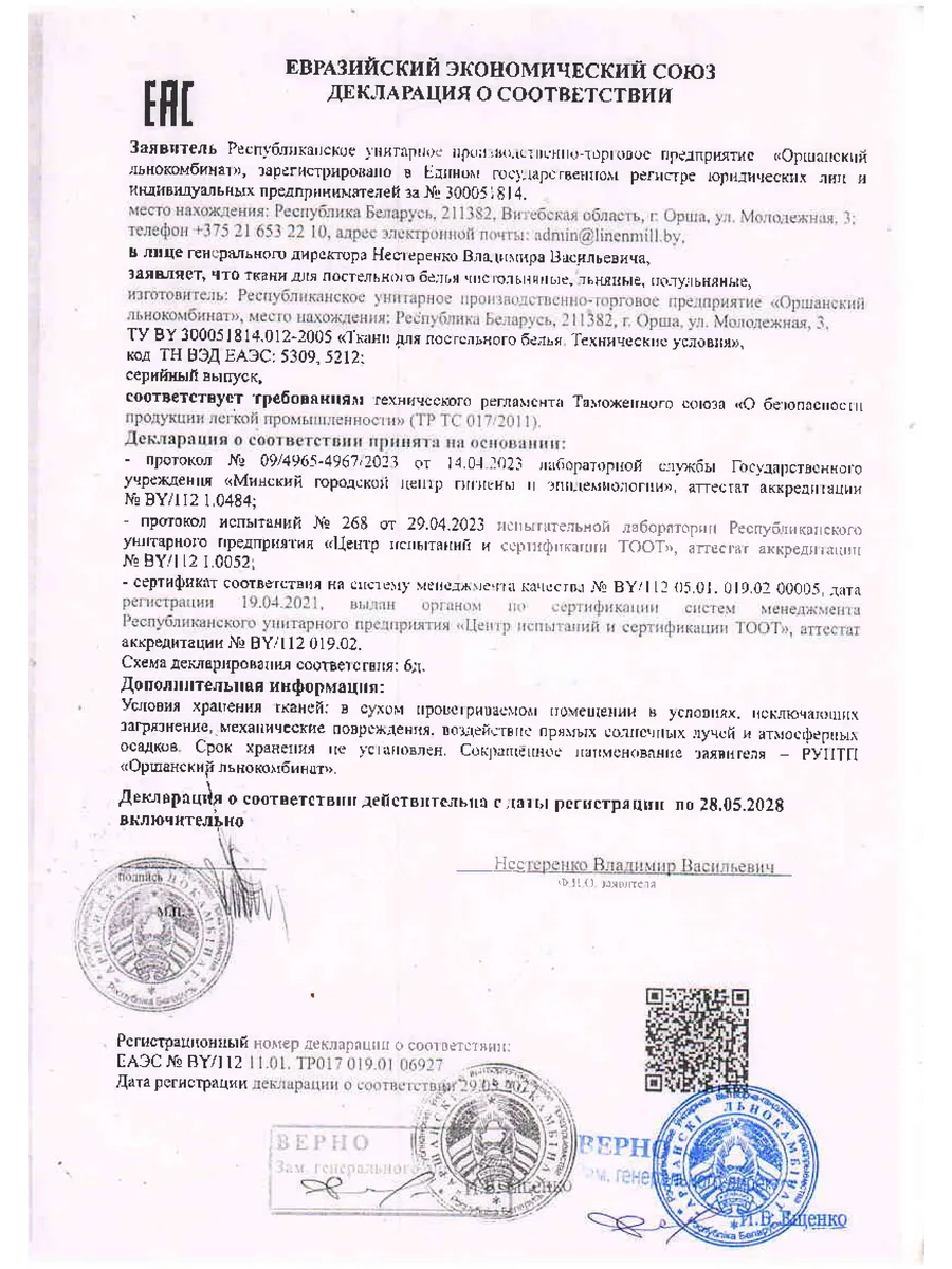 Стирка до 40°C, деликатный режим, сушить расправленным, гладить при 150–200°C |