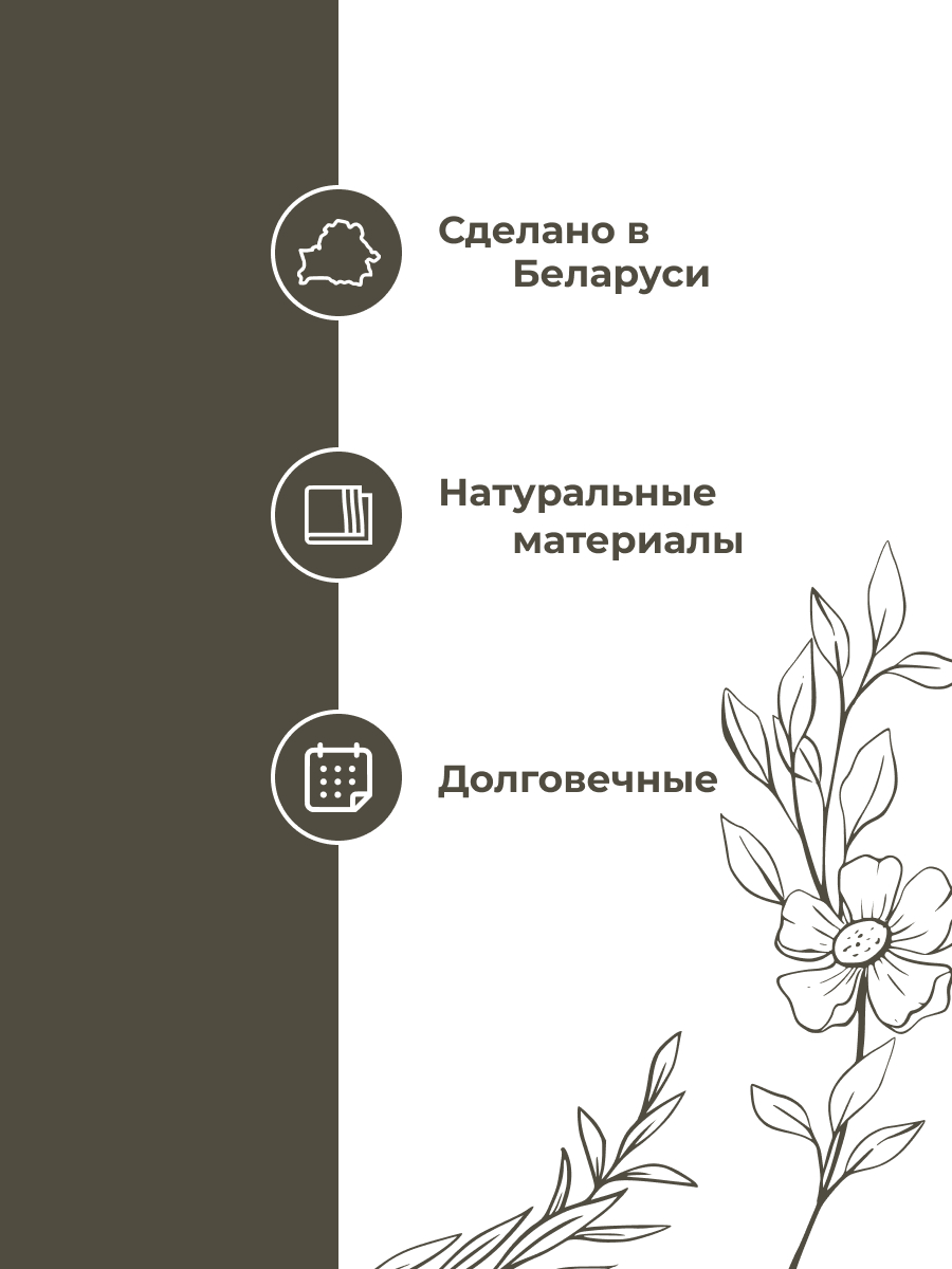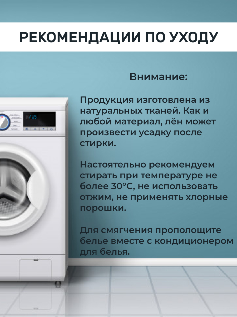 Стирка до 40°C, деликатный режим, сушить расправленным, гладить при 150–200°C |